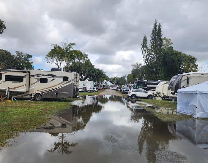 Sections of the campground roads and some of the campsites are usually a little water logged after it rains…. but last night’s torrential downpour left a LOT of standing water.