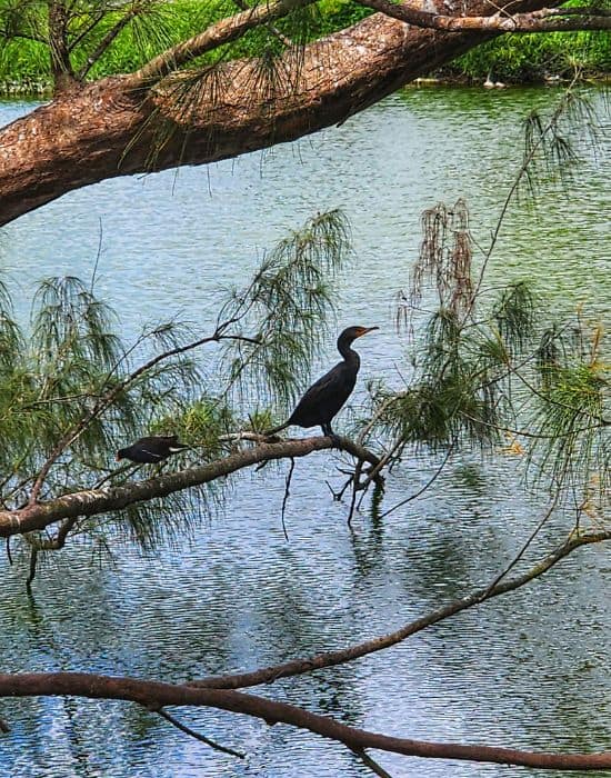 To my left, I spot two more black birds of different sizes on a tree branch hovering over the pond.