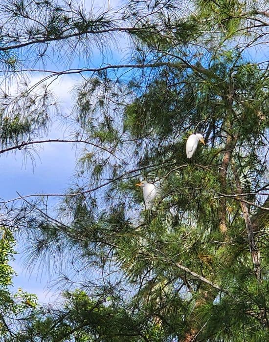 I watched several white birds fly gracefully through the air and perch among the trees.