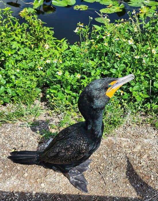 I pause to check out birds perched on a tree, surrounded by thick lily pads, growing out of the swamp.
