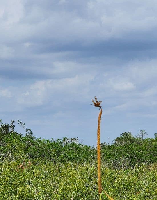 We pause to look over the marshland as a dragon fly lands on a stalk a few feet in front of us.