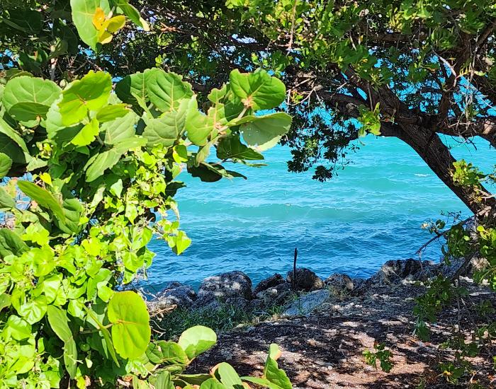 Trees stretch over the rocky beach. Their leaves are a vibrant green.
